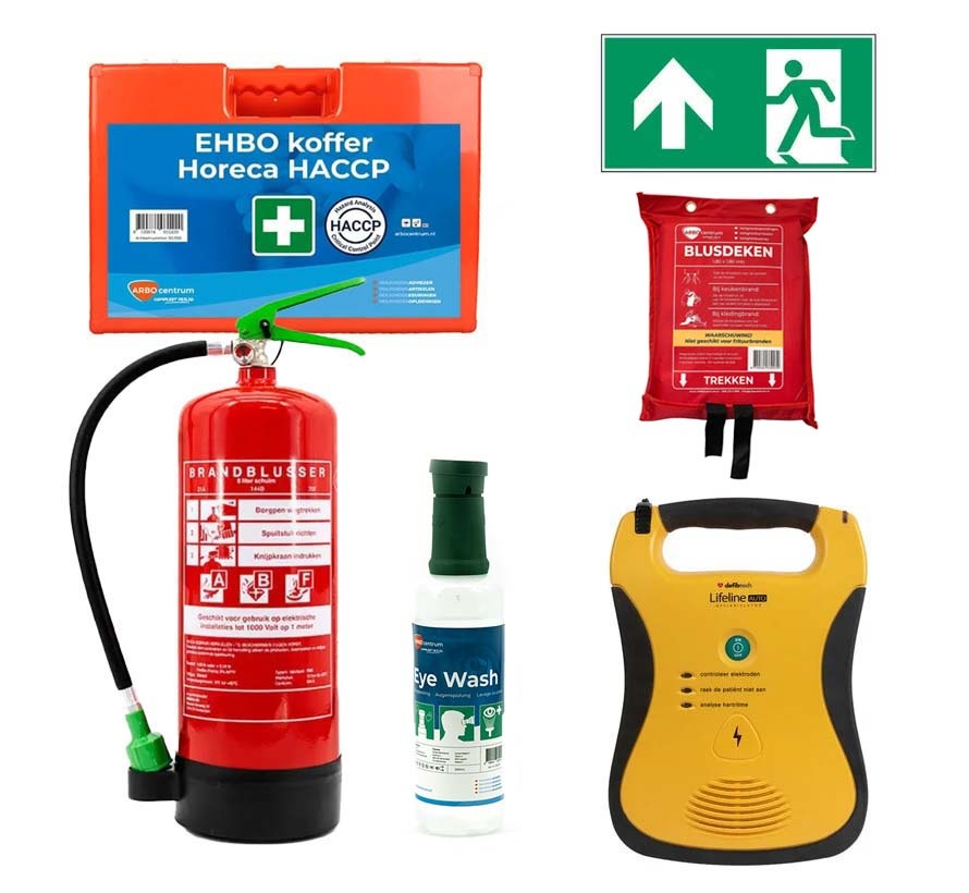 Ervaar gemoedsrust in jouw horecagelegenheid met ons uitgebreide veiligheidspakket. Dit zorgvuldig samengestelde pakket is perfect voor horecaondernemers die proactief willen handelen bij noodsituaties. Het pakket bevat een hoogwaardige EHBO-koffer die voldoet aan HACCP-normen, een oogspoelfles van 500 ml voor snelle oogverzorging, en duidelijke pictogrammen voor vluchtroutes. Daarnaast is een krachtige 6-liter schuimblusser inbegrepen, speciaal ontworpen voor vetbranden, evenals een ruime blusdeken van 180x180 cm. Voor extra zekerheid is het ook mogelijk om een AED toe te voegen, zodat je nog beter voorbereid bent op medische noodgevallen. Met deze essentiële veiligheidsuitrusting ben je in staat om snel en effectief te reageren, waardoor de veiligheid van jou, je team en je gasten gewaarborgd is. Focus je op de kwaliteit van je service, terwijl je weet dat je optimaal bent uitgerust voor elke situatie.
