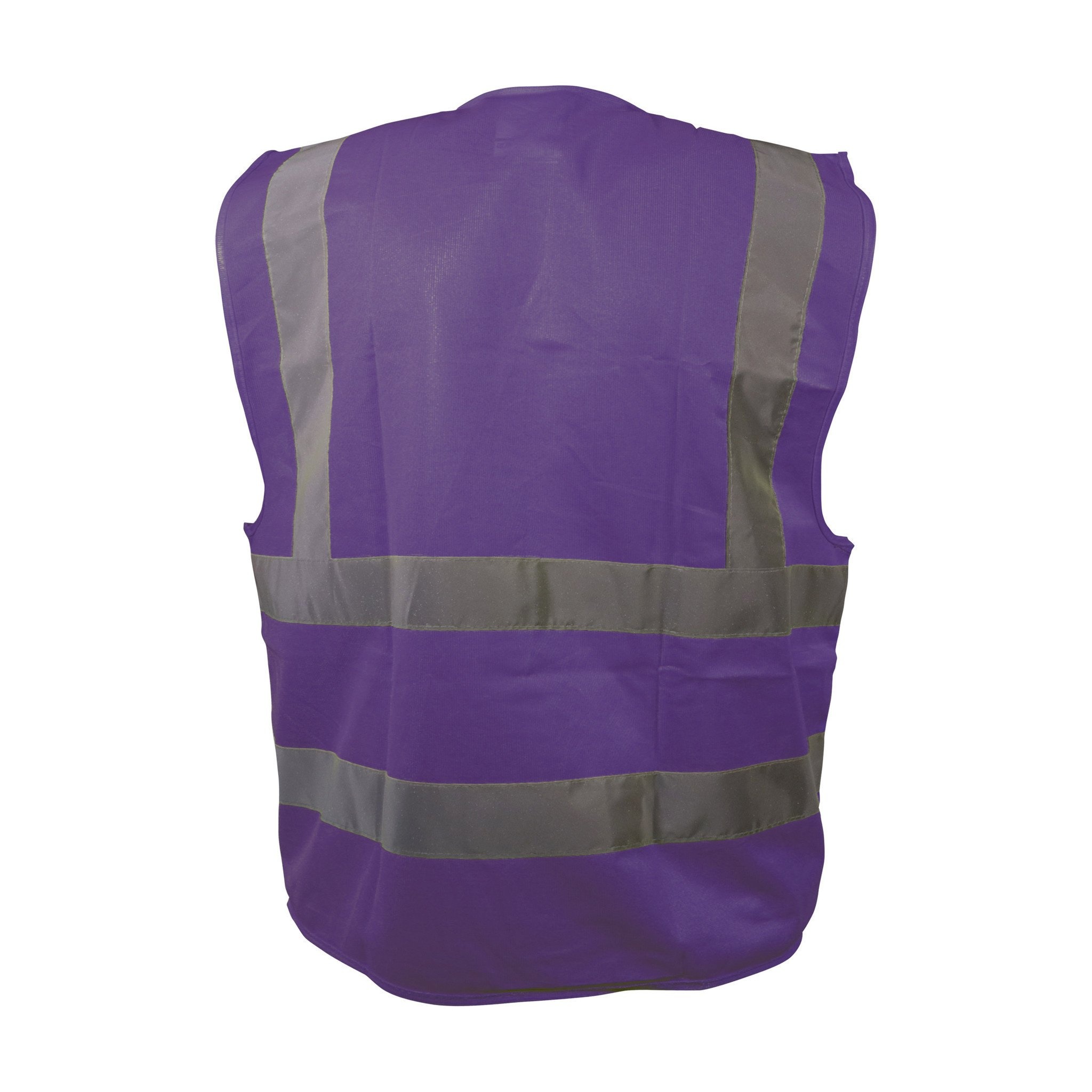 veiligheidshesje paars zorgt voor veiligheid op de werkvloer, in openbare ruimtes en tijdens evenementen. Door de kleur paars en de horizontale en verticale reflecterende strepen die oplichten in het donker valt het veiligheidshesje extra goed op. Veiligheidsvest Het hesje is gemaakt van 100% polyester en heeft een klittenband sluiting. Door het dragen van deze veiligheidshesjes zorg je ervoor dat je bij een calamiteit goed opvalt. De maten zijn M, L, XL en daardoor geschikt voor iedere volwassene. Het veiligheidshesje is conform EN ISO20471 C2.